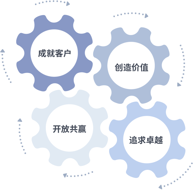 成就客户是一切决策的出发点,创造价值是衡量所有工作的标准,追求卓越是78m威九国际做事做人的态度,开放共赢是78m威九国际的格局也是最终的结果。价值观的齿轮环环相扣,推动着组织里的每个人不断向前。